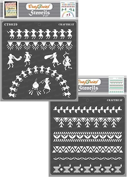 craftreat stencil warli and warli borders 2 pcs reusable painting template for home decor crafting diy albums scrapbook and printing on paper floor wall tile fabric wood 6x6 inches