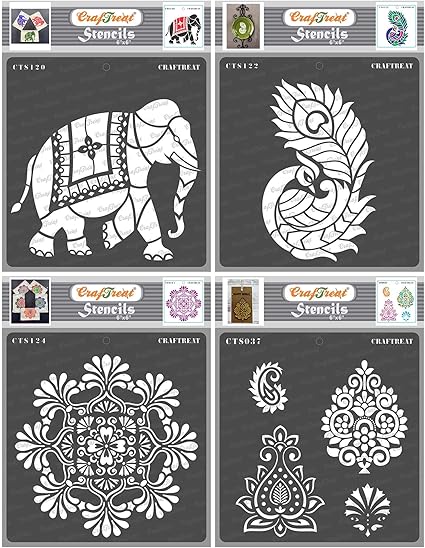 craftreat stencil indian elephant mandala2 side feathered peacock and indian motifs 4 pcs reusable painting template for home decor crafting diy albums and printing on paper 6x6 inches amazon co uk