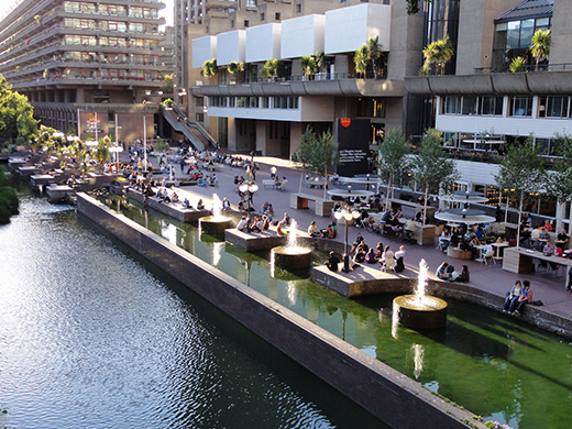 sunk water garden in the middle of the barbican where they re showing the eames ibm 1964 world fair multi screen movie riveting