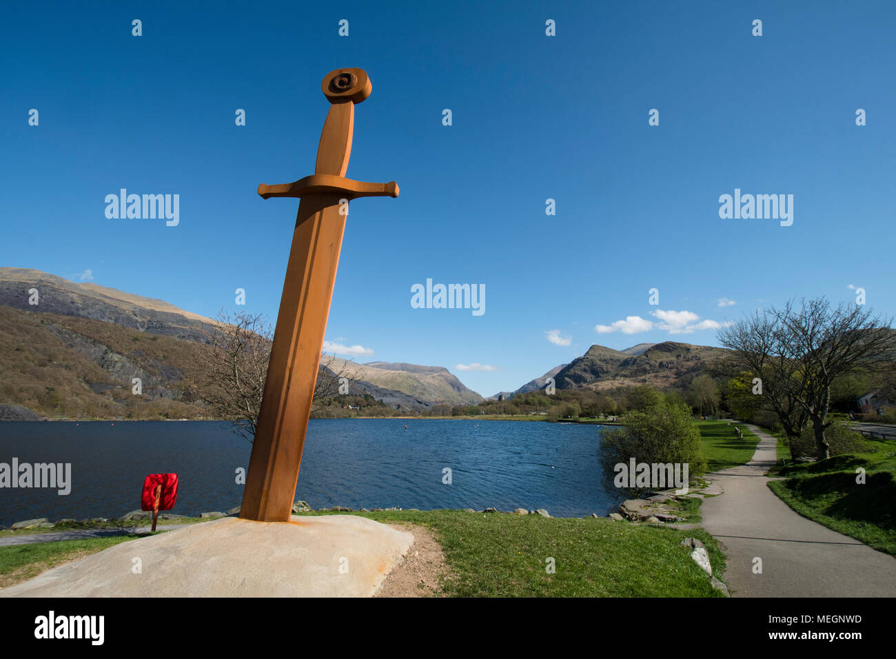 a 20 foot high iron sculpture of king arthurs excalibur stands beside llyn padarn in the village of llanberis north wales stock photo alamy