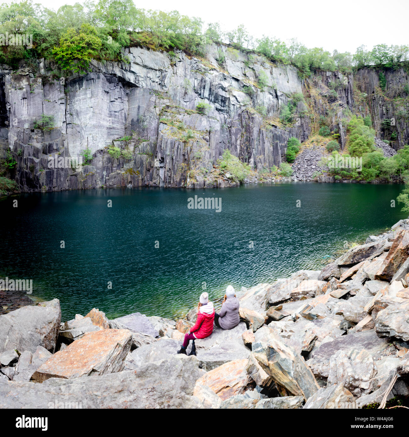 two girls sitting on the rocks at secret lake blue lake in llanberis snowdonia in wales 12th of may 2019 stock photo alamy