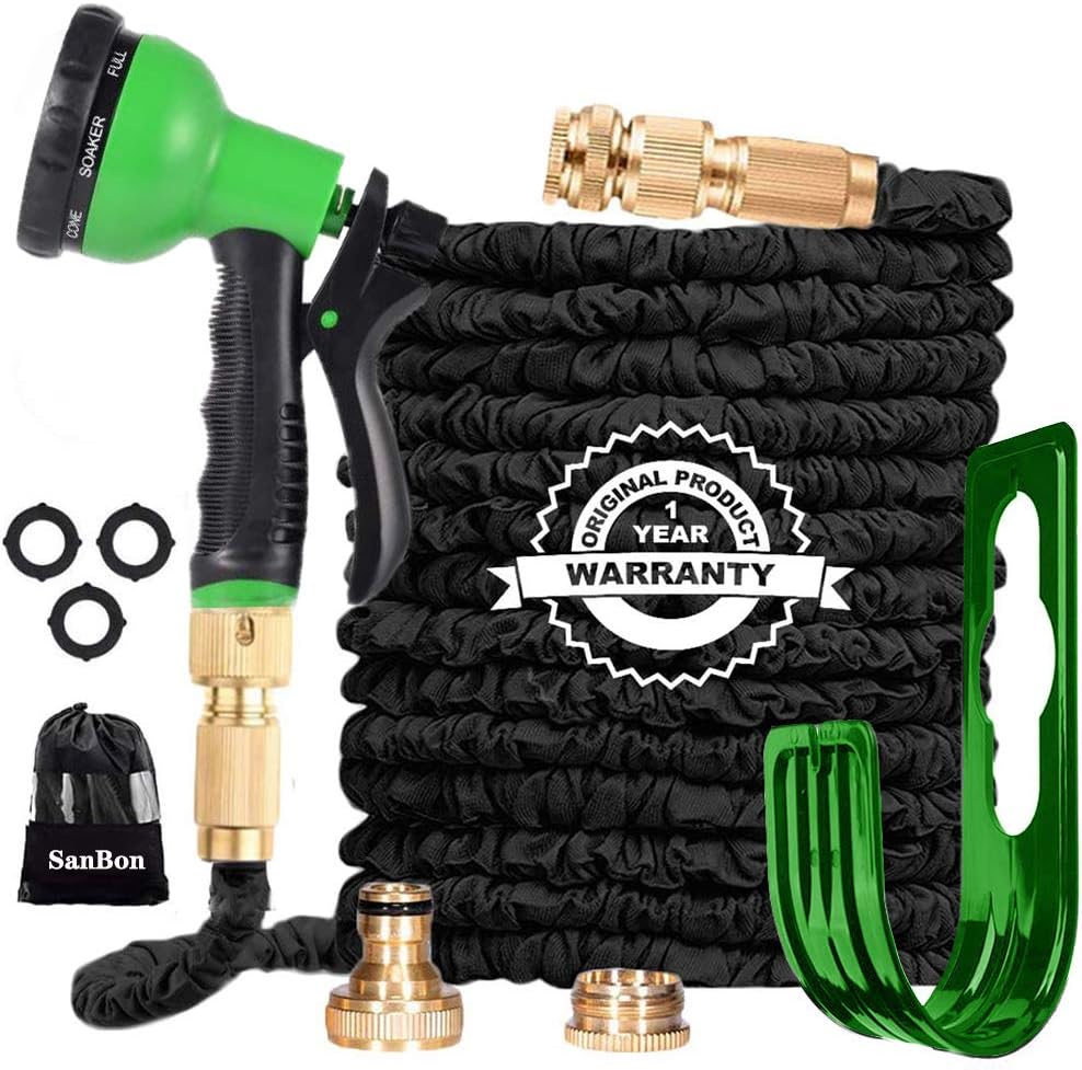 sanbon 100ft garden hose reel expandable 3 times tpe super strength high pressure flexible water hose 8 function high pressure spray nozzle with 3 4 solid brass fittings comes with free hose holder garden outdoors hoses